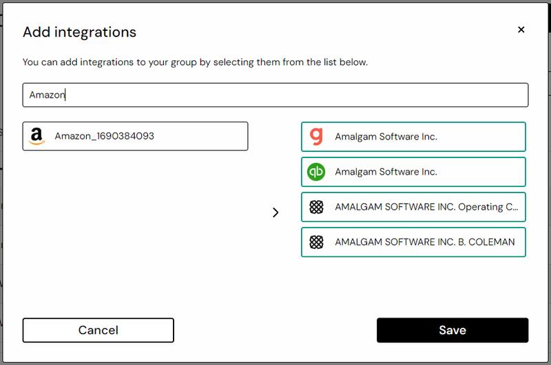 Add integrations to your group with the “+” button next to the Integrations header. You can search your integrations and add them in bulk.