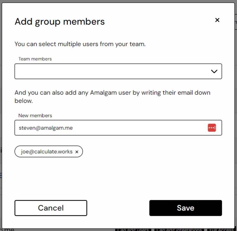 To add a User to the group, use the “+” button next to the Users header. You can add users in bulk, either by choosing a user from your Team, or by entering any other user by email into the second field. This allows you to add users from both your team, and other external teams (clients or consultants, etc.).