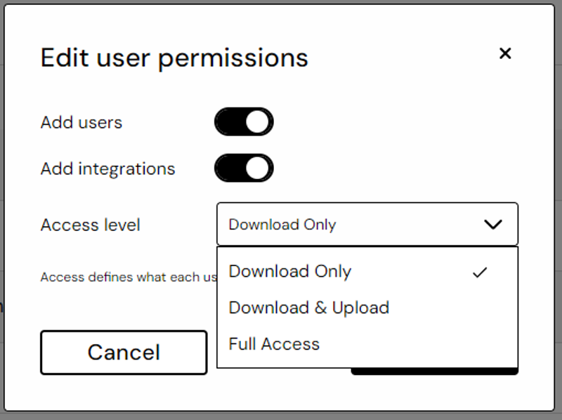 Each user will be added with full access, by default. To change a user’s permissions, click on the “lock” button on the user, then select the permission level you would like that user to have.
