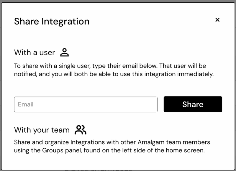 **Important Note:**integrations can only be shared via email if the user’s email matches the email of their Amalgam account. So, for example, if you had two different email accounts, clicking on the link would only work if the invitation was sent to the same account that the User signed up to Amalgam with.