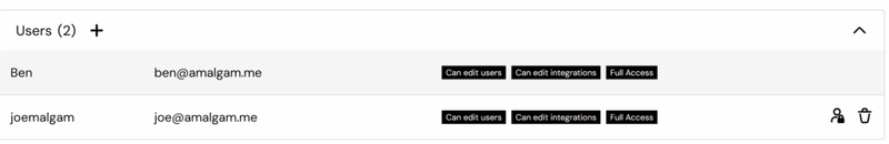 To edit a user’s permissions, click on the “lock” icon next to their name. You can define a permissions level for the integrations inside the group (e.g. read-only), and define whether they have permission to edit elements of the group itself.